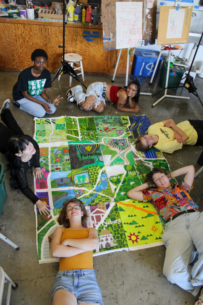 In my most recent year of YAAW, my team worked on a quilt-painting of a map of the area. There were many hurdles, but we were all able to depict the places we, and the community, treasure most. As team photographer, I took this photo on one of our final days working with the quilt. Dayanna, Ashton, Ethan, Brooklyn, Liz and Rachel laid with it during our lunch break.