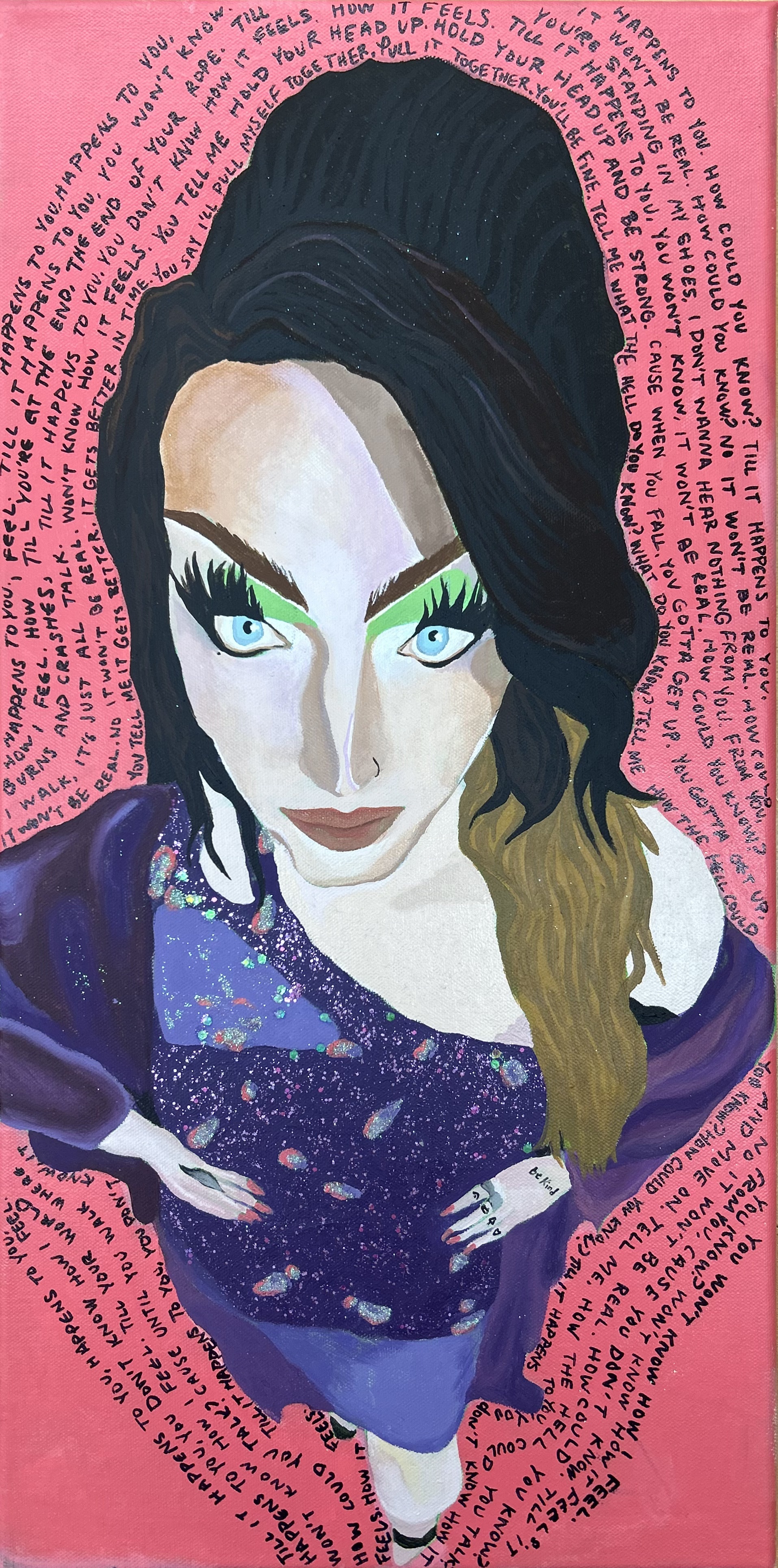 Unique perspective portrait of Toledo drag queen Levi Tracy. Made with acrylic paint, glitter and alcohol markers, the piece stands as a reminder of self-expression and includes the subject’s favorite anthem (Lady Gaga’s “Til it happens to you.”
